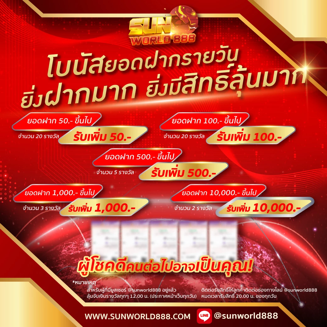 เรื่องเงินทองเป็นสิ่งที่ไม่เข้าใครออกใคร การได้เล่นเว็บที่จ่ายเงินจริงและรวดเร็วคือสวรรค์ของนักเสี่ยงโชคทุกคน เมื่อเราทำกำไรได้แล้วก็ย่อมอยากได้เงินมานอนกอดให้ชื่นใจ ถอนไวทันใจ Sunworld888 เงินเข้าบัญชีไว ไม่ต้องรอนาน ปลอดภัยร้อยเปอร์ เป็นสิ่งที่การันตีได้ว่าคุณจะไม่ต้องมานั่งปวดหัวหรือกังวลว่าจะโดนโกง ระบบออโต้ที่นี่ทำงานได้อย่างแม่นยำและรวดเร็วปานสายฟ้าแลบ เพียงแค่กดทำรายการยอดเงินก็เด้งเข้าบัญชีทันที ไม่ต้องทักหาแอดมินให้เสียเวลา แถมยังรองรับทุกธนาคารชั้นนำรวมถึงวอเลทอีกด้วย ความมั่นคงทางการเงินระดับประเทศทำให้เรากล้าจ่ายทุกบิล ไม่ว่าคุณจะแตกหลักร้อยหรือหลักล้านก็ถอนได้หมดไม่อั้น นี่แหละคือความสบายใจที่หาจากที่ไหนไม่ได้อีกแล้ว อยากรวยแบบไร้ความกังวลต้องที่นี่ที่เดียวเท่านั้น